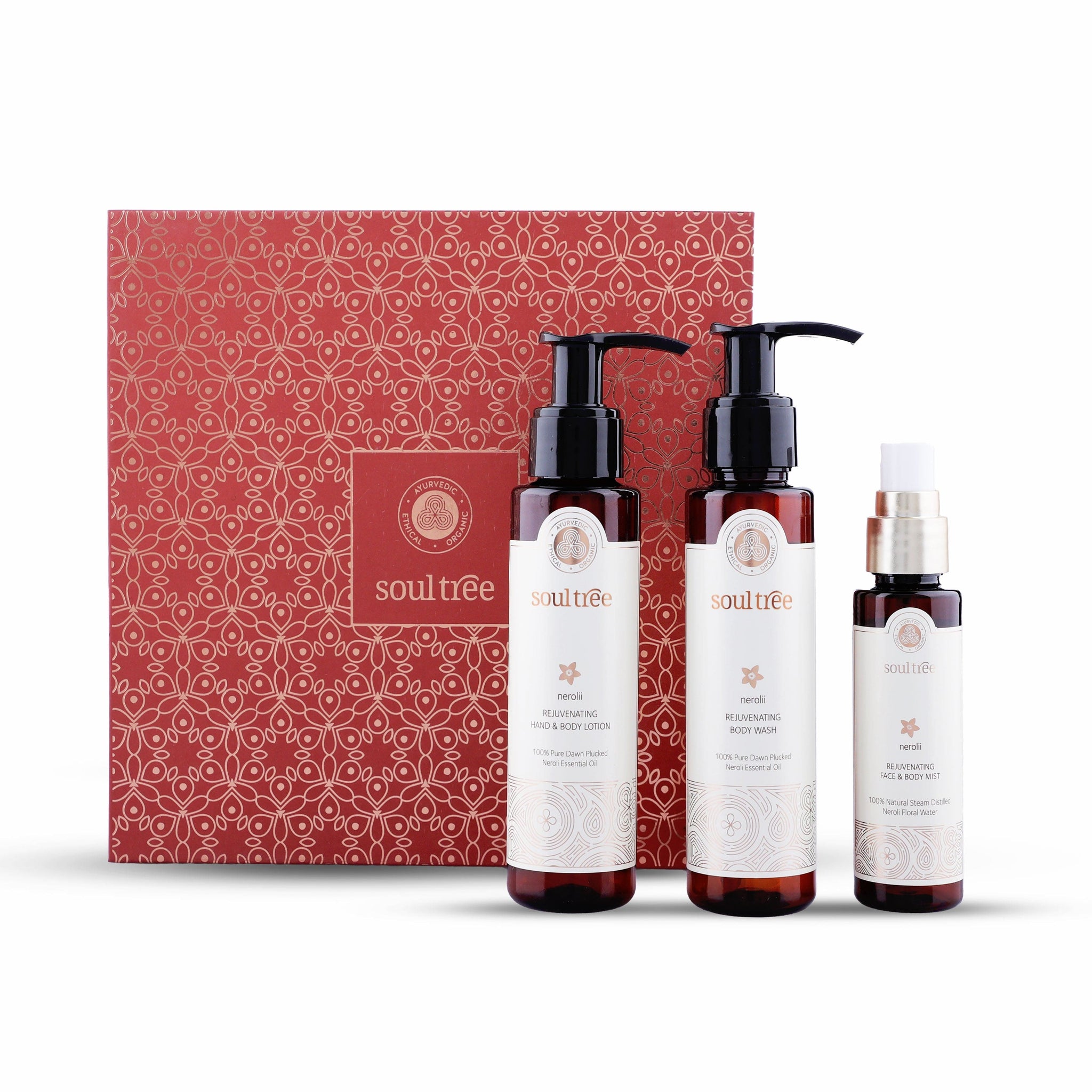 Complete Ayurvedic Set: This exquisite collection features a silken Body Lotion, an invigorating Shower Gel, and a revitalising Face & Body Mist, all infused with the vibrant essence of Neroli.